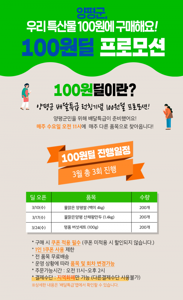 배달특급 앱에서 양평군 지역화폐로 결제하면 배송비 포함 '100원'으로 특산품을 선착순 구매할 수 있는 것이 특징이다.