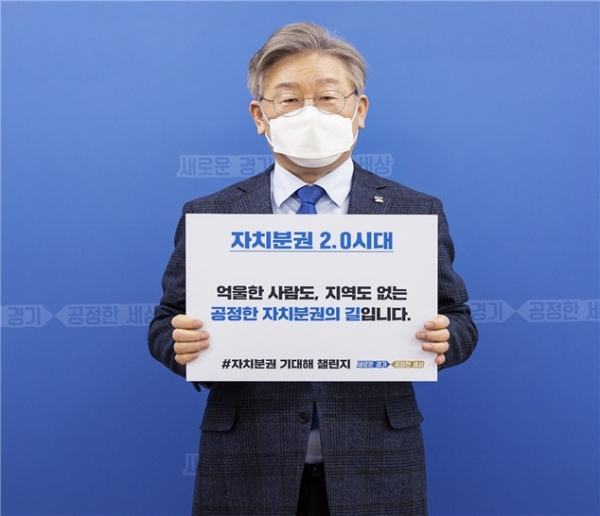 이시종 충북지사의 지명을 받아 챌린지에 참여한 이재명 지사는 ‘자치분권 2.0시대, 억울한 사람도 지역도 없는 공정한 자치분권의 길이다’라는 문구가 새겨진 팻말을 든 사진과 응원 메시지를 자신의 공식 사회관계망서비스에 게시했다.