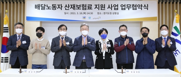 이재명 경기도지사는 강순희 근로복지공단 이사장, 제윤경 경기도일자리재단 대표이사와 18일 오후 경기도청 상황실에서 이 같은 내용의 ‘경기도 플랫폼 배달노동자 산재보험료 지원사업 업무협약’을 체결한다.