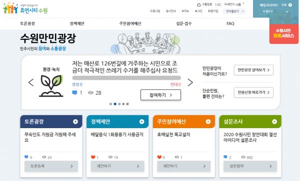 수원시는 시민들의 이용 편의를 위해 지난 10일 수원만민광장 홈페이지를 개편했다.