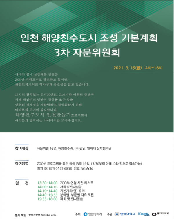 인천광역시는 ‘인천 해양친수도시조성 기본계획 수립 용역’의 완성도를 높이기 위해 전문가 의견 수렴을 위한 ‘제3차 전문가 자문위원회’를 19일 오후 2시 개최한다고 밝혔다.