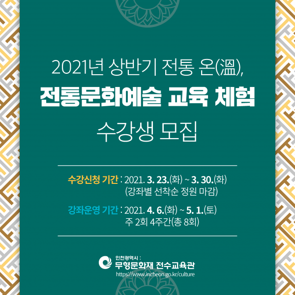 강좌는 4. 6.~5. 1., 4주 간 주 2회, 인천무형문화재 전수교육관에서 진행되며 수강료 무료, 재료비는 별도이다.