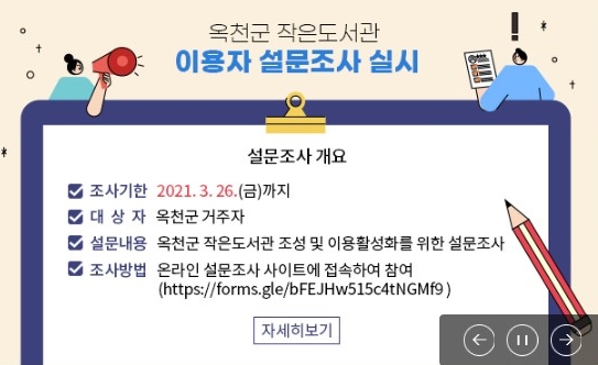 [충청뉴스큐] 옥천군은 작은 도서관 조성 및 활성화에 기초자료로 활용하고자 옥천군민을 대상으로 오는 3월 26일까지 설문조사를 실시한다.