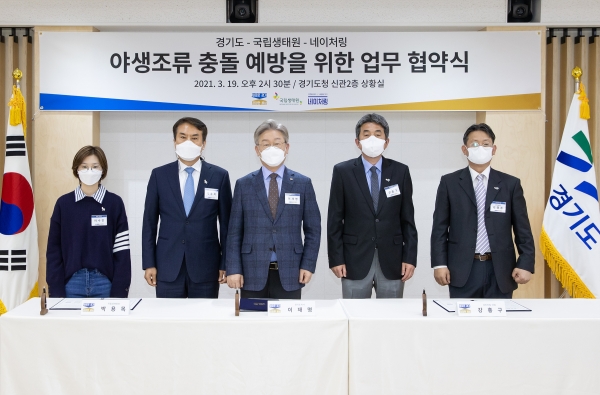 이재명 경기도지사는 19일 오후 경기도청 상황실에서 박용목 국립생태원장, 강홍구 네이처링 대표와 함께 이 같은 내용의 ‘야생조류 충돌 예방을 위한 업무협약’을 체결했다.