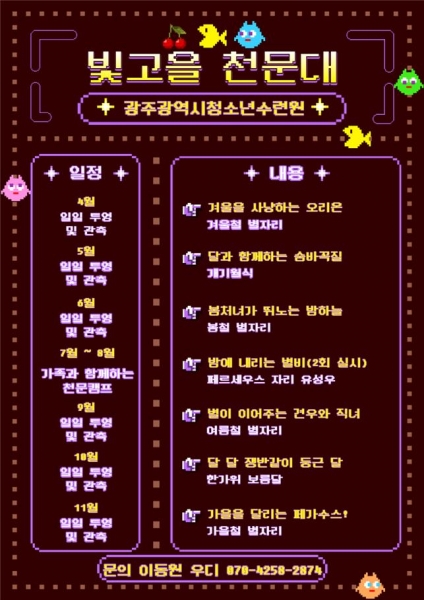 광주시 청소년수련원 바로가기 : http://fmayouth.co.kr‘가족과 함께하는 천문캠프’는 7~8월 한 달에 한 차례씩 총 2회 진행되며 6월 중 모집을 시작할 예정이다.