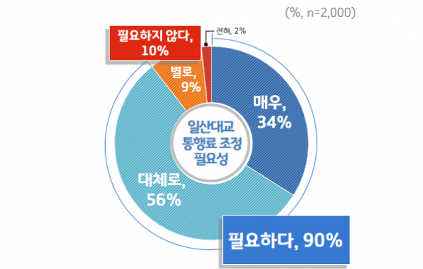경기도는 지난달 18일부터 23일까지 도민 2,000명을 대상으로 실시한 여론조사에서 응답자의 90%가 일산대교 통행료 조정이 ‘필요하다’고 답했다고 22일 밝혔다.