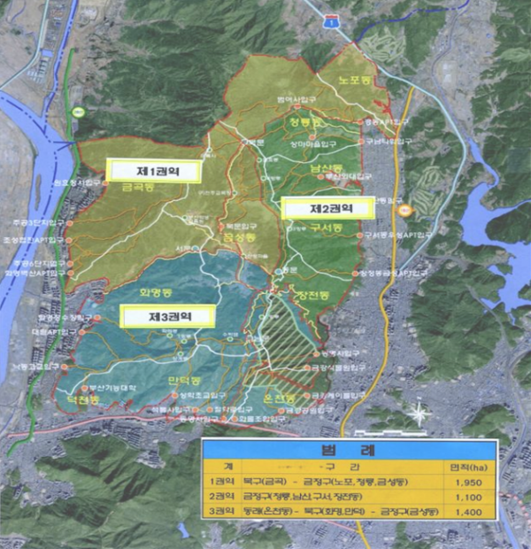 이번에 지정되는 지역은 북구 만덕1동, 덕천1동, 화명1·2동 지역 940필지 981ha 금정구 금성동, 장전1·2동 지역 282필지 308ha 동래구 온천1·2동 지역 255필지 111ha로 총 1,477필지 1,400ha이다.