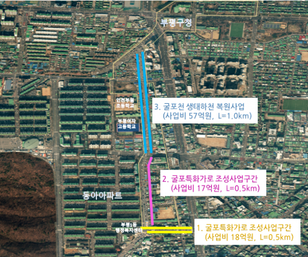 시에서 처음으로 복원되는 복개하천인 굴포천을 생태하천으로 조성하기 위해 추진 중인 ‘굴포천 가공선로 지중화 사업’은 올해 그린뉴딜 사업으로 선정되면서 확보한 국비 6억 8400만원을 포함, 총 사업비 91억원이 투입된다.
