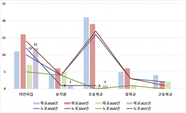 질병보건통합관리시스템 신고에 따르면 도내 교육기관에서의 집단 내 수인성, 식품매개 감염병 발생은 2018년 45건, 2019는 49건, 지난해 16건, 올해 3월 3째 주까지 14건이었다.