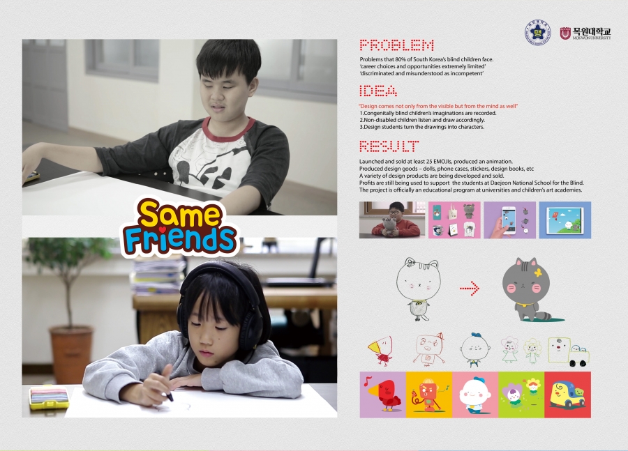 대전맹학교(교장 최규붕)는 시각장애 학생 디자이너 되기 캠페인 ‘Same Friends’ 가 2018 대한민국광고대상 프로모션 부문 은상을 수상했다고30일 밝혔다. 대한민국광고대상은 1994년부터 한국광고총연합회에서 주최하며, 한국 광고계의 최고 권위의 광고상으로 매년 1000여점의 작품들이 엄선되어 출품되며 온라인 사전 심사를 거처 올해는 52개 작품이 수상했다. 대전맹학교의 이번 캠페인은 시각장애학생들에게 디자이너의 꿈을 심어주기 위해 시작되었으며, 광고회사 ‘DIN’ 과 3개의 제작사의 참여로 이루어졌다. 맹학교 학생들이 상상 속 그림 스토리를 말하면 또래의 비장애학생들이 스케치를 하고 제작사(사람 사람, NOA, 목원대학교)의 그래픽 작업을 통해 다양한 디자인 작품을 완성했다. 또한, 완성된 캠페인을 통해 고양이 인형과 메이킹 영상, 캐릭터엽서, 전자파스티커, 기부 감사패 등 디자인 상품을 만들어 펀딩에 성공해 판매 수익금이 대전맹학교 발전기금으로 기부했으며, 광고회사 및 제작사와 공동으로 캠페인 영상 ‘Same Friends’를 대한민국광고대상에 출품해 은상을 수상하는 쾌거를 올렸다. 대전맹학교 최규붕 교장은 “이번 캠페인을 통해 시각장애학생들에게 디자이너의 꿈을 심어주고 또한 대한민국 광고대상 은상까지 받게 되어 매우 기쁘다”며 “시각장애 학생들이 새로운 꿈을 향한 도전을 할 수 있는 기회가 자주 있기를 바란다”고 말했다.