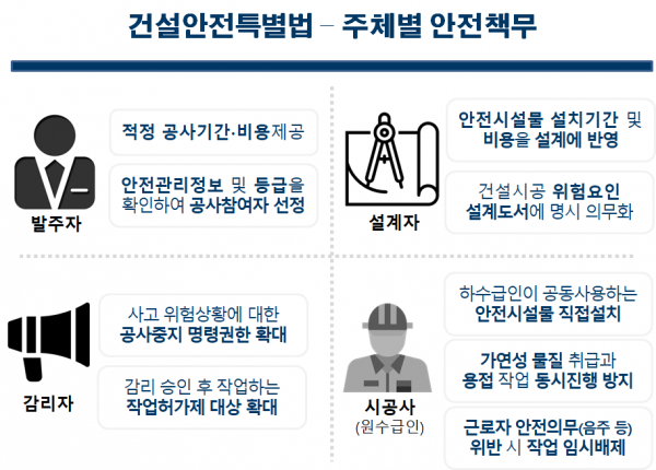 우선, 발주자부터 설계·감리자, 시공자까지 건설 주체별 안전 책임을 명확히 규정하기 위해 ‘건설안전특별법’을 조속히 제정한다.
