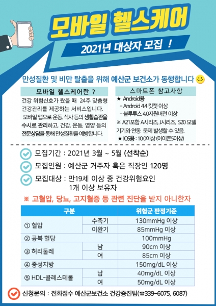 [충청뉴스큐] 예산군보건소는 2021년 모바일 헬스케어 참여자 120명을 선착순 모집한다.