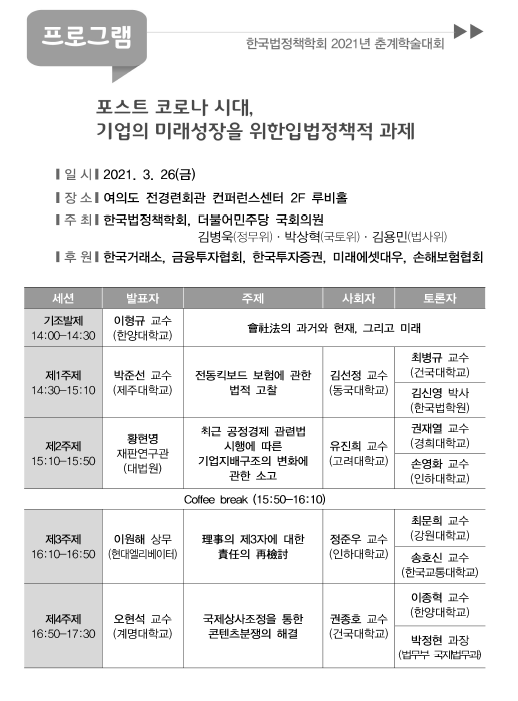 이형규 한양대학교 교수의 ‘회사법의 과거와 현재, 그리고 미래’기조발제를 시작으로 최근 이슈가 되고 있는‘전동킥보드 보험에 관한 법적 고찰’, ‘공정경제 관련법 시행에 따른 기업지배구조의 변화에 관한 소고’, 이사의 제3자에 대한 책임의 재검토, ‘국제상사조정을 통한 콘텐츠분쟁의 해결’현안에 대해 전문가들이 주제별로 논의한다.