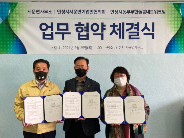 [충청뉴스큐] 안성시 서운면사무소와 서운면 기업인협의회, 동부무한돌봄네트워크팀이 지난 25일 서운면사무소에서 업무 협약식을 가졌다.