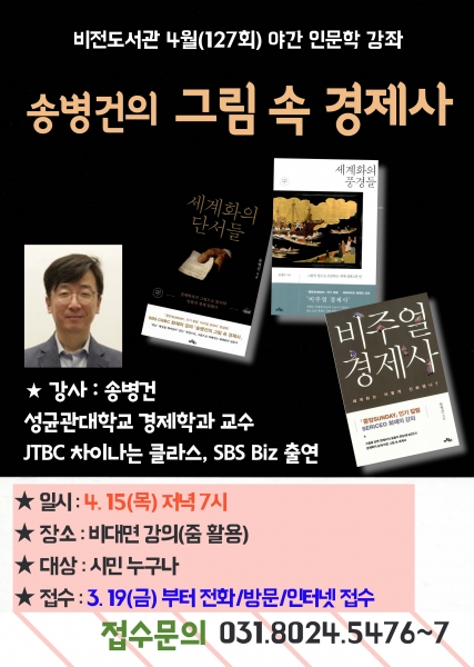 4월 15일 저녁 7시에 온라인으로 진행되는 127번째 인문학 강좌에서는 성균관대학교 경제학과 송병건 교수를 초청, ‘그림 속 세계사’를 주제로 그림의 시대적 맥락을 캐고 동시대인의 생활상을 재구성하고 역사적 중요성을 평가해보는 경제사적 그림 읽기로 인류의 경제 문화사를 그림으로 풀어볼 예정이다.