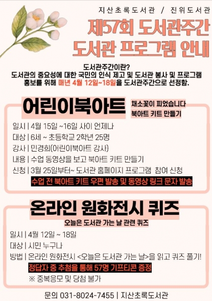 [충청뉴스큐] 평택시립지산초록도서관과 진위도서관은 한국도서관협회에서 정한 제57회 도서관주간을 맞아 도서관과 책의 가치에 대해 지역 주민에게 알릴 수 있는 프로그램을 운영한다.