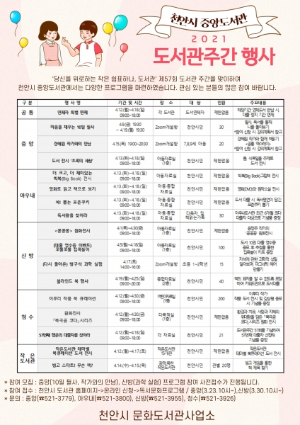 [충청뉴스큐] 천안시 중앙도서관이 제57회 도서관 주간을 맞아 ‘당신을 위로하는 작은 쉼표 하나, 도서관’이라는 주제로 중앙·아우내·신방·청수·작은도서관에서 4월 한 달간 다채로운 행사를 개최한다고 29일 밝혔다.