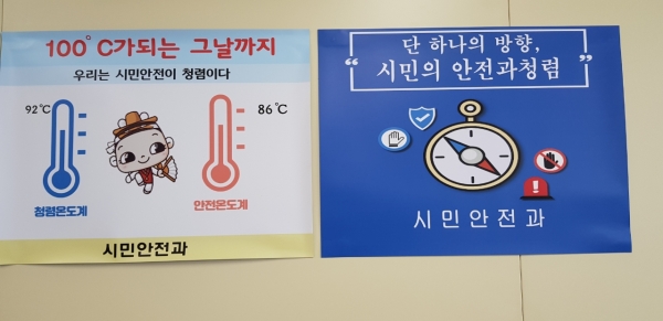 앞서 시민안전과는 지난달 청렴 온도계를 제작 게시했으며 시민의 안전온도와 공직자의 청렴온도를 높이기 위해 전력을 다하고 있다.