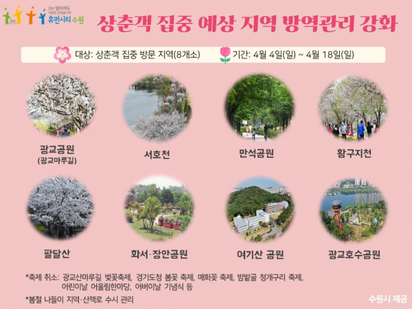 [충청뉴스큐] 수원시가 상춘객이 집중적으로 방문할 것으로 예상되는 지역의 방역 관리를 강화한다.