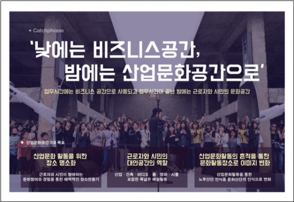 ‘산단 산업문화공간 대개조 사업’은 도시 패러다임 변화에 발맞춰 노후 산업단지의 부정적 이미지 개선과 젊은 인력의 근로여건 개선 및 대규모 주거공간과 인접한 산업단지의 특성을 살린 시민참여형 문화·예술 소비 공간과 산업공간으로의 대전환을 추진하는 사업이다.