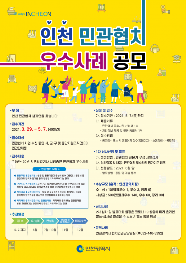 아울러 공모 우수사례는 인천 협치 우수사례집에 게재해 시민과 공무원들의 협치 이해를 돕는 자료로 활용할 예정이다.