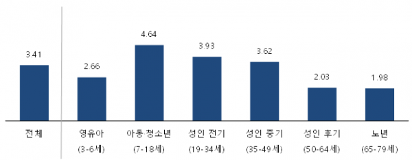 특히 영유아, 아동·청소년이 50%에 가까운 문화예술교육 참여율을 보이는 반면, 19세 이후부터 문화예술교육 참여율이 급격히 낮아져 성인 후기에 이르면 19.4%까지 감소했다.