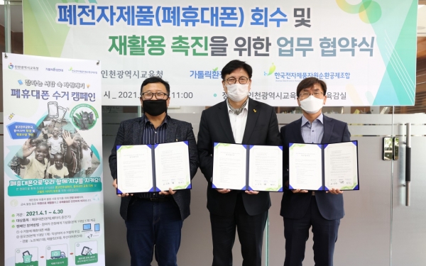 [충청뉴스큐] 인천광역시교육청은 30일 ‘잠자는 서랍속 자원 캐기’ 공동실천 행사의 원활한 추진을 위해 가톨릭환경연대, 한국전자제품자원순환공제조합과 협약을 체결했다.