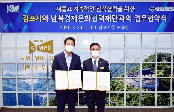 30일 정하영 김포시장과 임종석 대통령 외교안보특보 겸 경문협 이사장은 김포시청 소통실에서 남북협력을 위한 업무협약을 체결했다.