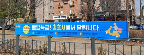 김포시는 지난 19일 고촌읍 태리 인터체인지 인근에 대형 홍보물을 게시하고 정하영 시장이 직접 출연하는 홍보 영상을 제작하는 등 배달특급 홍보에 앞장서기도 했다.