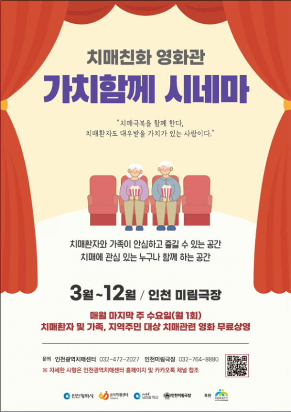‘가치 함께 시네마’는 3월 31일을 시작으로 11월까지 매월 인천 동구 소재 인천미림극장에서 운영되며 치매환자와 가족이 안심하고 찾을 수 있는 환경을 조성해 치매 진단 이후 문화·여가 생활이 중단되지 않고 행복한 경험을 지속하도록 지원하는 영화관람 프로그램이다.