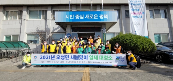 [충청뉴스큐] 평택시 오성면은 지난 30일 새봄을 맞아 깨끗하고 쾌적한 생활환경 조성을 위해 이장협의회, 주민자치위원회, 새마을 부녀회, 새마을 지도자 등 관내 13개 단체와 공직자 50여명이 참여해 민·관 합동 일제대청소를 실시했다.