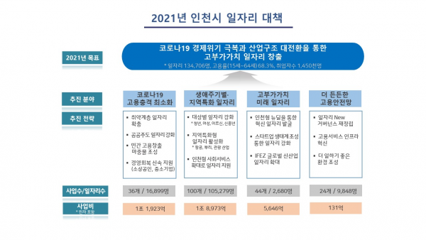이에 인천시는 2021년은 고용회복의 전환점이 되는 중요한 해로 보아 대규모의 공공 일자리 창출을 통해 고용회복의 마중물 역할을 하고 인천형 뉴딜을 통한 산업구조 대전환으로 고부가가치 일자리 창출을 도모하겠다는 계획을 발표했다.
