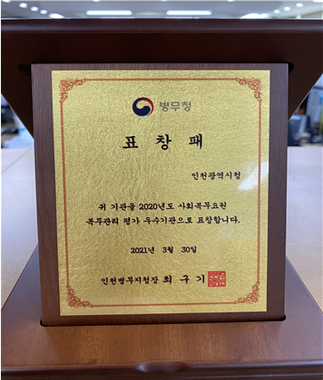 이번 표창은 인천병무지청에서 지역내 사회복무요원을 관리하는 총1,238개 기관을 대상으로 사회복무요원의 성실복무 유도 및 복무만족도 향상을 위한 근무여건 개선 등 복무관리 실적이 탁월한 기관을 선정한 것으로 지난 1년간 인천광역시 복무관리 전 분야에 걸쳐 무사고는 물론 근무여건, 복무관리 등 세부 평가에서 높은 점수를 받아 우수기관표창을 수상하게 됐다.