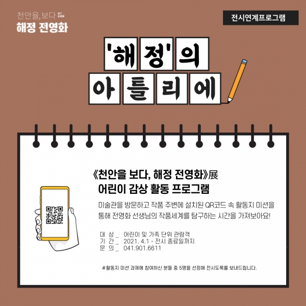 [충청뉴스큐] 천안문화재단 천안시립미술관이 4월 1일부터 18일까지 ‘천안을, 보다 해정 전영화’ 특별전과 연계한 어린이 대상 비대면 감상프로그램 ‘해정의 아틀리에’를 운영한다.