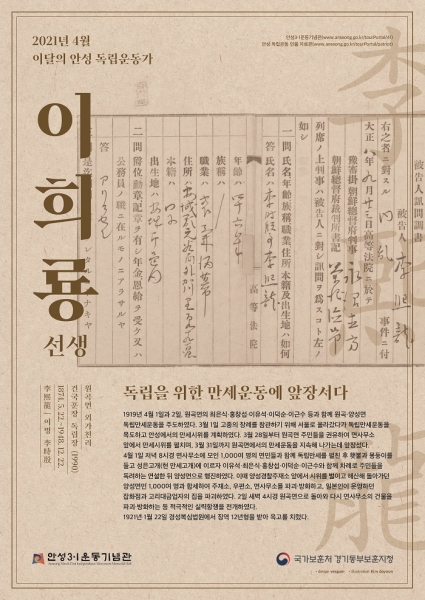 [충청뉴스큐] 안성시와 경기동부보훈지청이 공동으로 2021년 4월 이달의 안성 독립운동가에 1990년 건국훈장 독립장을 추서 받은 이희룡 선생을 선정했다.