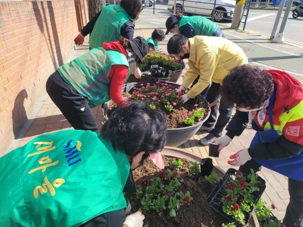 [충청뉴스큐] 평택시 송북동은 지난 31일 코로나19로 침체된 분위기를 살리고 주민들에게 화사한 볼거리를 드리기 위해 청사주변과 쓰레기 무단투기 취약지역 등 6개소에 봄꽃을 식재했다.