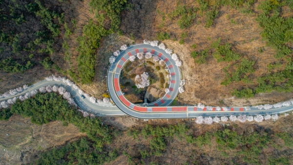 [충청뉴스큐] 한국의 아름다운 길 100선에 선정된 충남 청양군 칠갑산 나선형도로에 벚꽃이 만개해 지나는 이들의 마음을 사로잡고 있다.