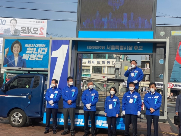 그러면서 “화가 난다고 내곡동 땅 특혜 의혹에 대해 말 바꾸는 일을 되풀이하고 시장직을 시작도 전에 갈라치기해 세대 간, 계층 간의 갈등을 조장하는 후보, 공정과 상생을 위협하는 후보에게 서울을 맡기면 안된다”고 주장하면서 “그동안 민주당 화가 나지만 그래도, 서울에는 박영선이 있다”고 강조하고 “여성의 섬세함으로 어머니의 따뜻함, 강인함으로 상처받은 우리 서울을 포용하고 치유할 수 있는 후보가 박영선이며 박영선이 서울시민과 함께 새로운 역사를 쓸 수 있도록 기회를 달라”고 호소했다.