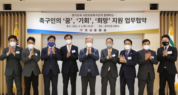 협약에 따라 경기도와 시민프로축구단은 축구 환경 개선에 적극 노력하고 유소년 축구 꿈나무 육성과 유망주 입단 테스트 기회를 확대하기로 했다.