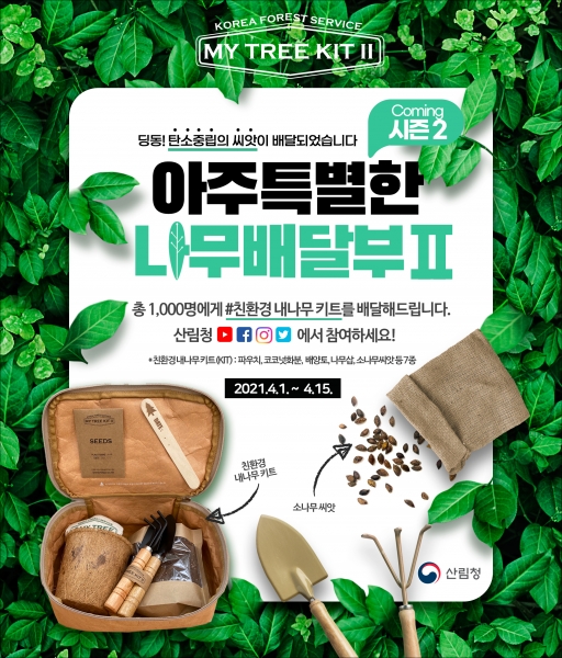 ‘아주 특별한 나무 배달부’ 시즌2 이벤트는 4월 1일 오후 1시부터15일간 산림청 유튜브, 페이스북, 인스타그램 등 사회관계망서비스에서 진행되며 채널별로 영상을 시청한 후 ‘탄소중립을 실천할 수 있는 나만의 작은 실천법’을 한 줄 댓글로 작성하고 #산림청 #탄소중립식목일 #친환경내나무키트 등 해시태그를 달면 이벤트 참여가 완료된다.