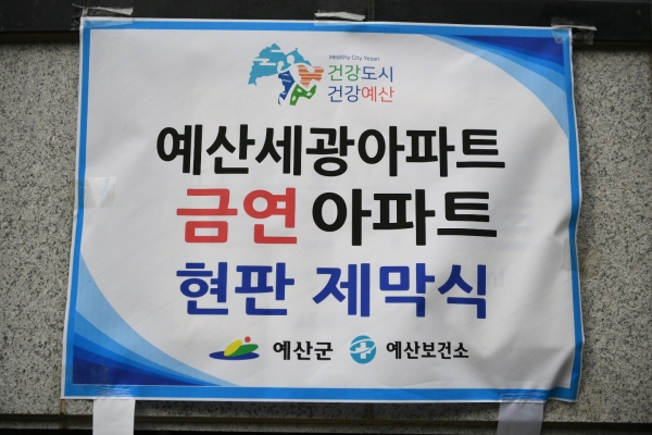[충청뉴스큐] 예산군은 예산읍 소재 세광엔리치타워아파트를 제4호 금연아파트로 지정하고 1일 현판식을 가졌다.