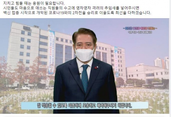 최 시장은 힘들 때는 응원이 필요하다며 시민들도 애쓰는 공무원들을 위해 격려의 추임새를 보내줄 것을 부탁했다.