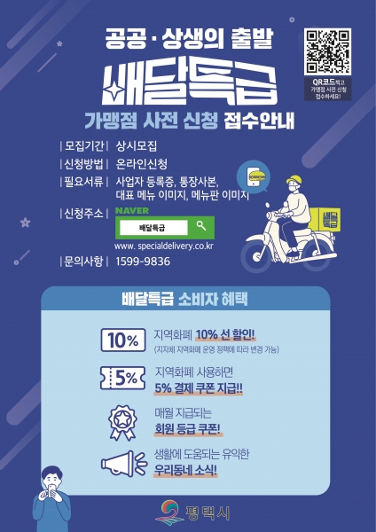 신청대상은 평택시 관내 외식업 매장을 운영하며 배달을 병행하는 업체로 가맹점을 희망하는 업주는 사업자등록증, 통장 사본, 메뉴판, 대표 메뉴 이미지 파일을 준비해서 배달특급 홈페이지에 신청하면 된다.