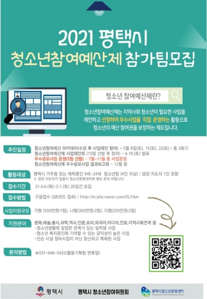 [충청뉴스큐] 평택시 위탁기관인 평택시청소년문화센터는 14기 평택시청소년참여위원회와 함께 2021년 청소년참여예산제 참가팀을 모집한다.