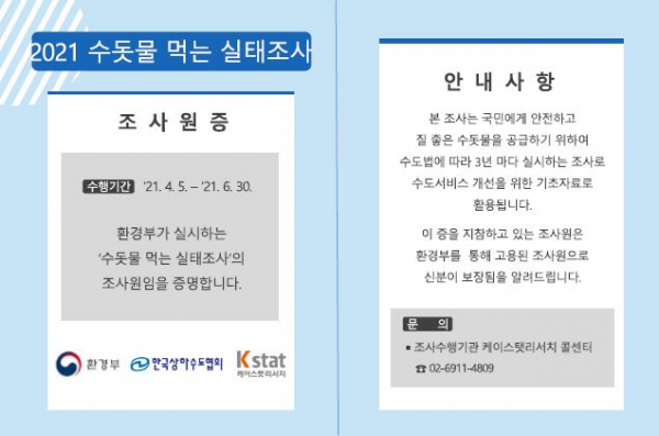 신진수 환경부 물통합정책국장은 “수돗물 음용률을 높이기 위해서는 국민의 입장에서 객관적으로 정책을 평가하고 취약요인을 파악해 개선해야 한다”며 “이번 실태조사가 수돗물 정책 개선에 기초역할을 할 것이며 공문을 지참한 조사원이 방문할 경우 관심을 가지고 조사에 응해 주길 부탁드린다”고 밝혔다.