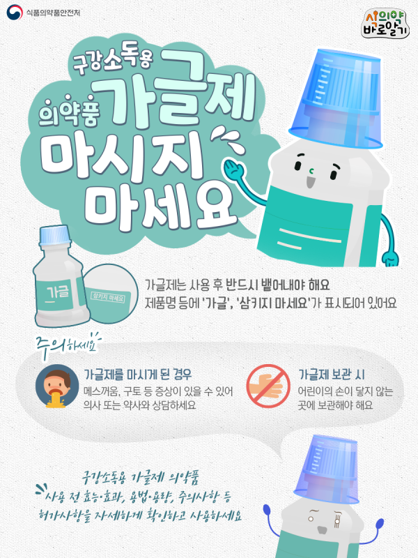 구강소독용 의약품 가글제 사용 전에 효능·효과, 용법·용량, 주의사항 등 허가사항을 자세하게 확인하고 사용해야 한다.