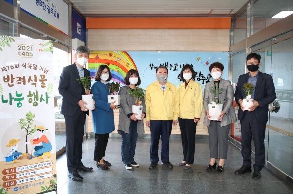 [충청뉴스큐] 광주시교육청이 5일 제76회 식목일을 맞아 탄소중립 실현, 녹색환경 구축, 화훼 소비 촉진, 직원 간 소통 강화 및 정서적 안정 도모를 위해 ‘공기정화 반려식물 나눔 행사’를 개최했다.