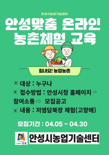 [충청뉴스큐] 안성시농업기술센터에서는 4월 5일부터 오는 4월 30일까지 안성맞춤 온라인 체험 교육생을 모집한다고 밝혔다.