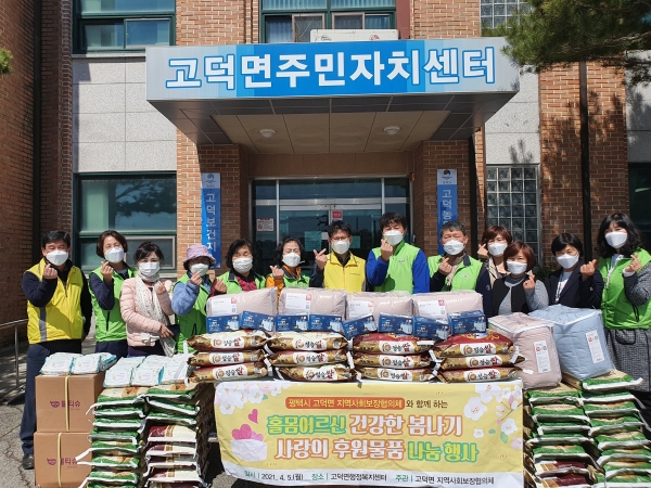 이번 나눔 행사는 고덕면 지역사회보장협의체 위원들이 승강기 청소 수익금, 회비 등을 모아 마련한 기금으로 어려운 이웃에게 후원하는 물품이라 더욱 뜻깊다.