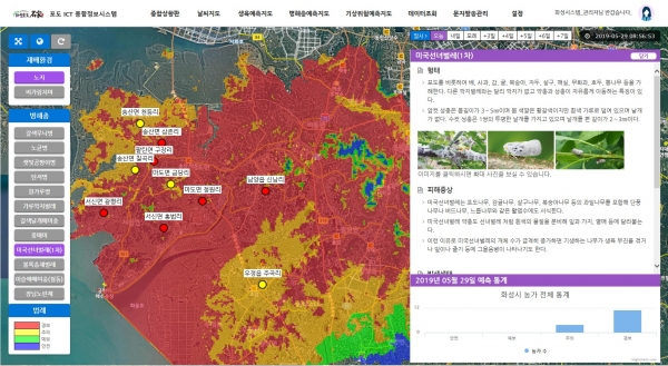과수 ICT 종합정보시스템은 관내에 설치된 10개의 기상장비를 통해 수집한 정보를 바탕으로 병해충, 기상재해 등 위험상황을 예측할 수 있는 스마트 시스템이다.